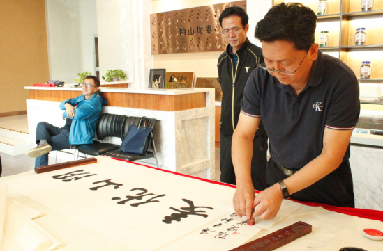 隨后,大家又來到燕麥博物館,感受燕麥文化、體驗(yàn)燕麥產(chǎn)品的同時(shí),并現(xiàn)場(chǎng)目睹書法名家張曉華老師的揮毫潑墨。孟才介紹,中國燕麥的市場(chǎng)份額在100億元以上,裸燕麥起源于中國,但是國內(nèi)燕麥深加工所用的原糧90%是進(jìn)口皮燕麥,只有10%是國產(chǎn)裸燕麥,主要原因是國產(chǎn)裸燕麥多采用傳統(tǒng)旱作耕作方式,人工除草,有機(jī)種植,不使用除草劑、農(nóng)藥、化肥等,畝產(chǎn)較低。但是,也正因如此裸燕麥的口感更好、質(zhì)量更佳且蛋白質(zhì)、脂肪、β-葡聚糖等營養(yǎng)成分均高于皮燕麥。得天獨(dú)厚的資源優(yōu)勢(shì)是陰山優(yōu)麥建企立身的根基和市場(chǎng)競爭的底氣,產(chǎn)品全部采用優(yōu)質(zhì)的國產(chǎn)裸燕麥就是陰山優(yōu)麥的核心競爭力!