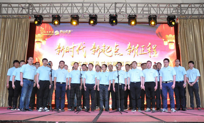 大會以播放短片的形式回顧了公司一年來的各項業(yè)務(wù)發(fā)展情況和取得的成績。副總經(jīng)理邰志東代表公司首先向全體人員致辭,而后在察右中旗烏蘭牧騎《時代贊歌》、《守望相助》的歌舞里拉開序幕。頒獎環(huán)節(jié),由22名優(yōu)秀行政管理人員、生產(chǎn)管理人員、生產(chǎn)服務(wù)人員、銷售人員和14個最佳效益獎、最佳質(zhì)量獎、最佳合作伙伴獎、優(yōu)秀團隊獎、董事長特別獎的獲獎代表上臺接受了公司各級領(lǐng)導(dǎo)的頒獎和祝賀。同時,原種生產(chǎn)管理中心、脫毒組培中心、原種生產(chǎn)管理中心、物流倉儲中心用《民豐之歌》和《民豐我們的家》兩首大合唱表達(dá)了對公司的贊美和熱愛之情。最后,大會在烏蘭牧騎《在你偉大的懷抱里》的舞蹈里走向高潮。表彰大會和文藝演出穿插進(jìn)行,環(huán)環(huán)相扣,方式新穎,得到了全體員工的一致好評,也為即將開始的新春生產(chǎn)種植工作注入了活力,帶來了動力。
